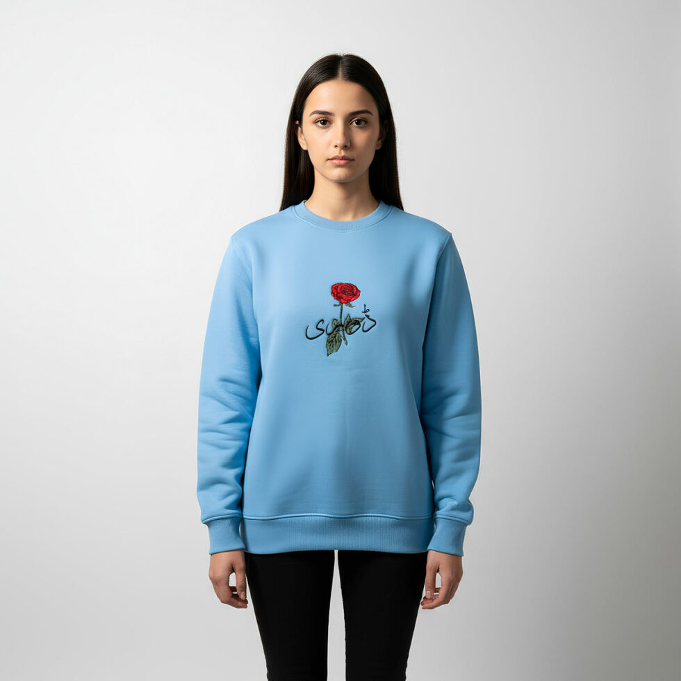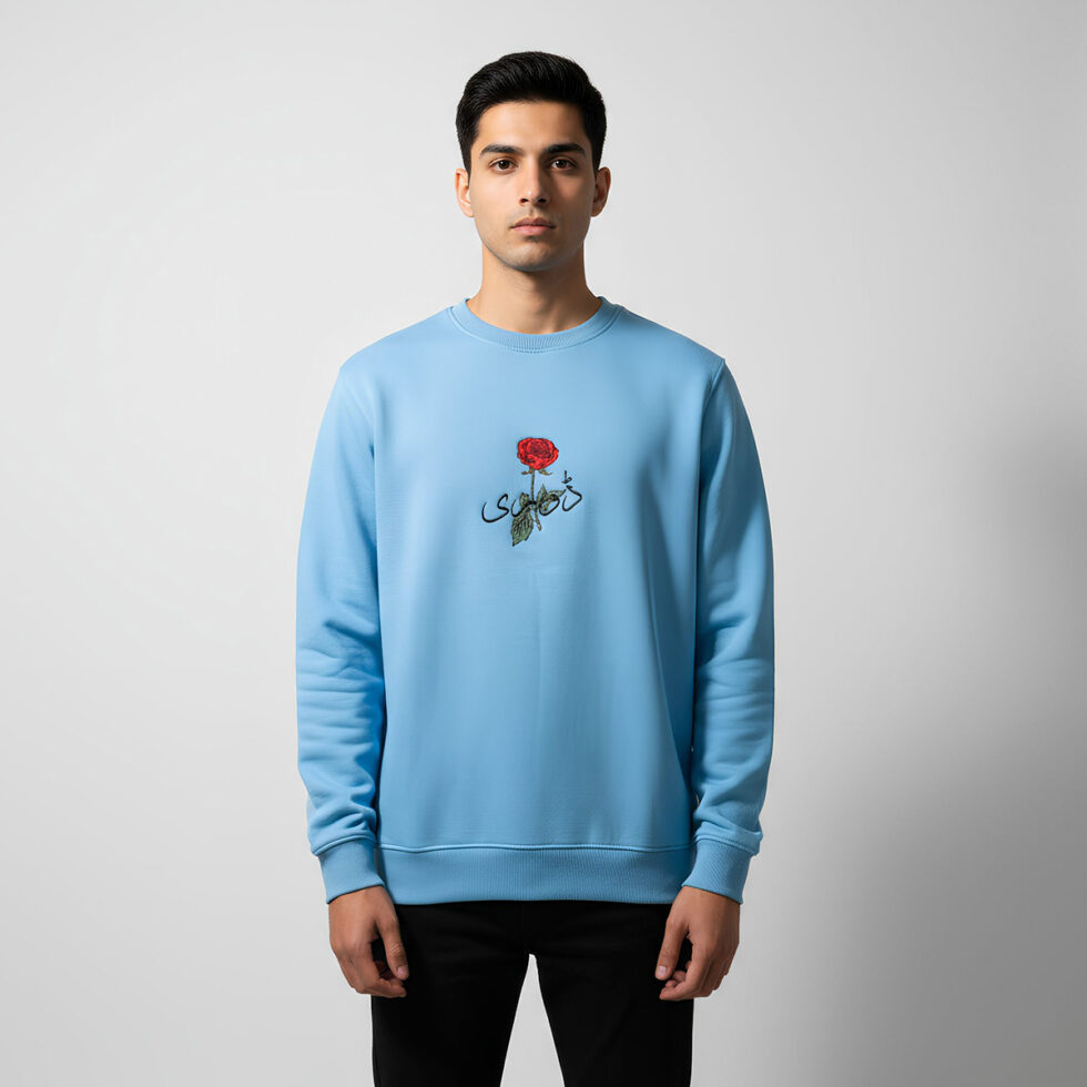 DORI’s blue rose embroidered sweatshirt blends culture and comfort — premium fleece, Urdu art, and minimal elegance for modern unisex streetwear.