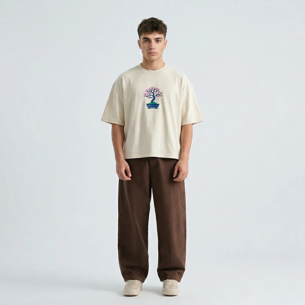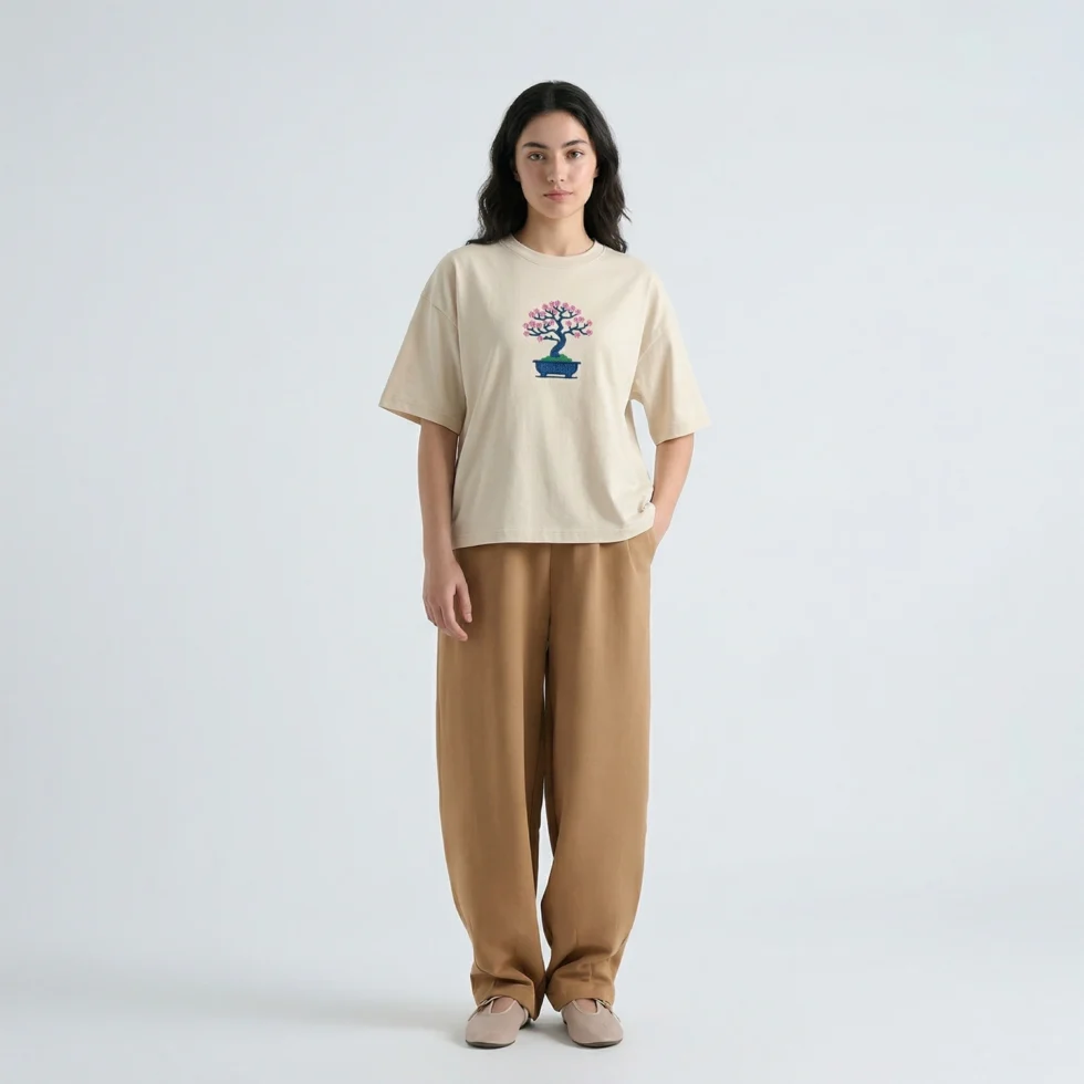 Shop Bonsai cotton drop shoulder T-shirt with oversized fit and breathable fabric. A unisex summer tee featuring minimal embroidered design for everyday comfort.