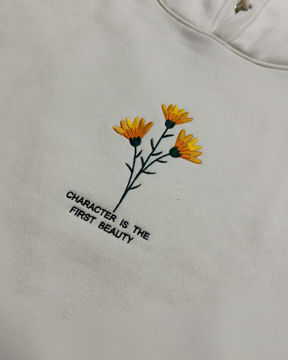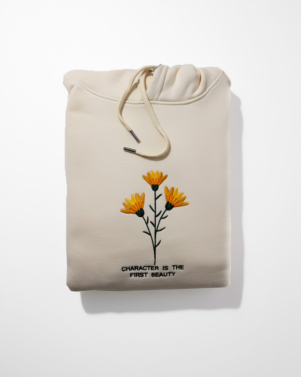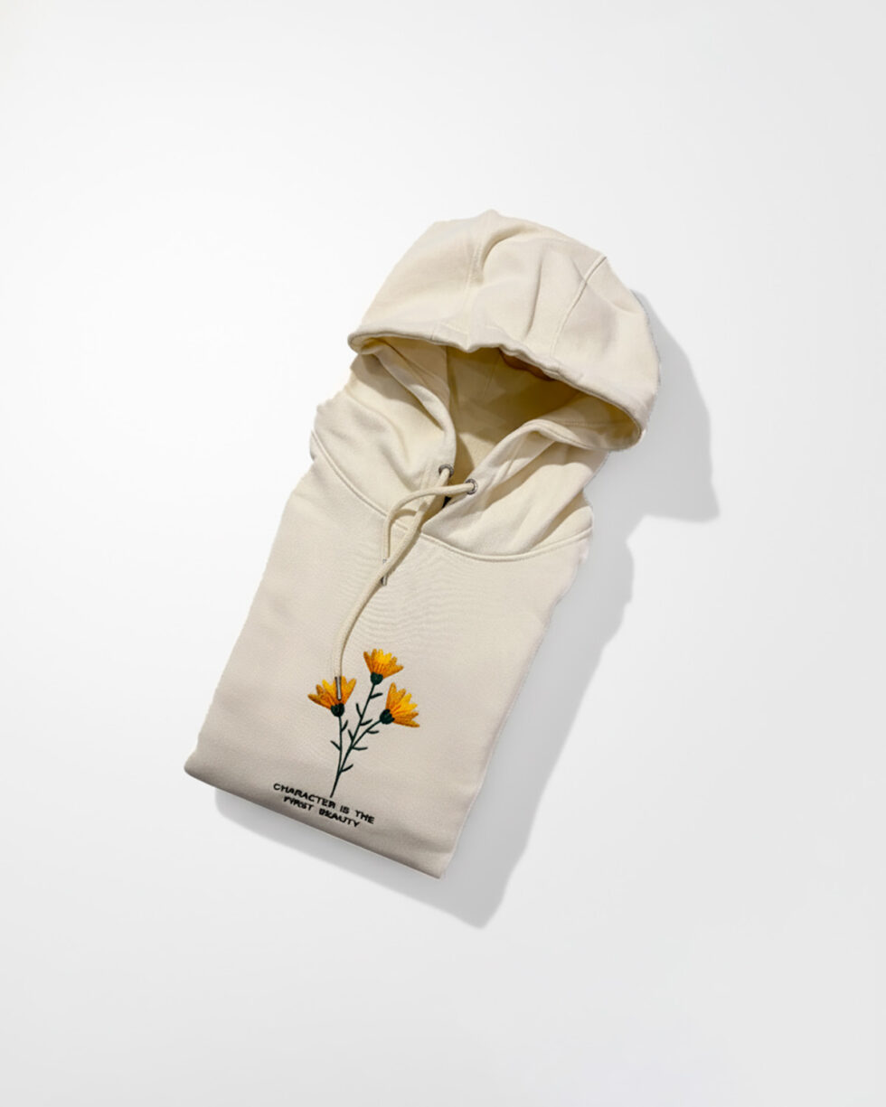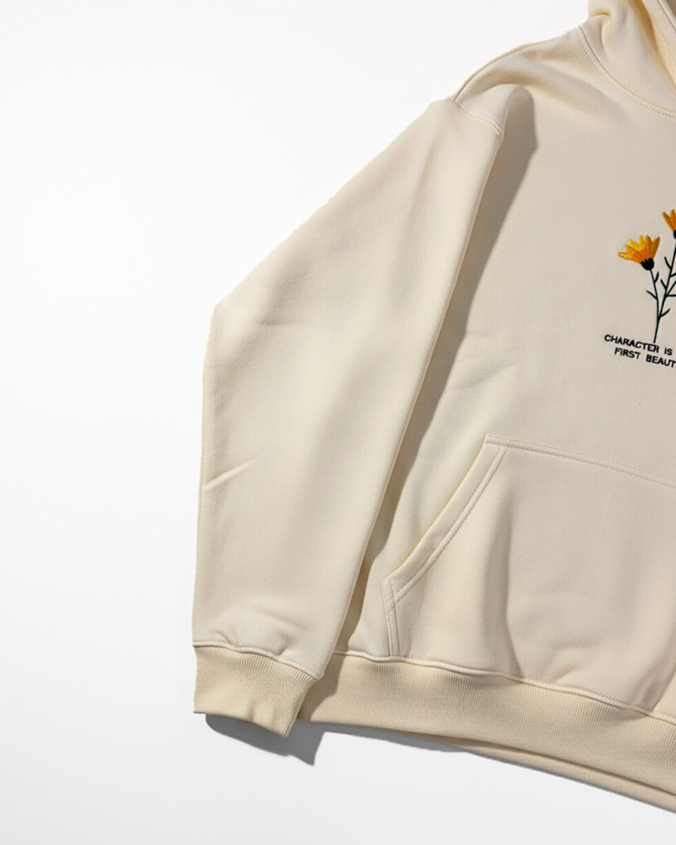 DORI’s cream floral embroidered hoodie adds grace to everyday wear — blending soft fleece, minimal floral detail, and timeless neutral elegance.