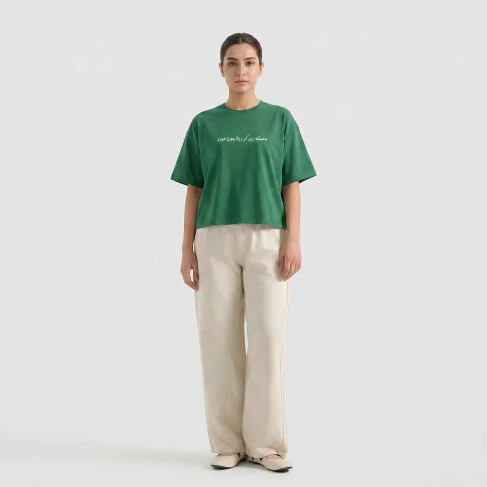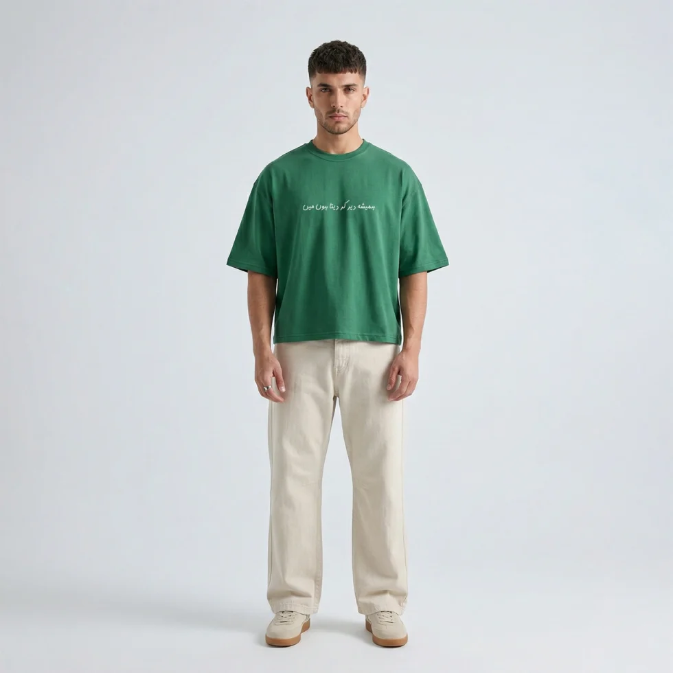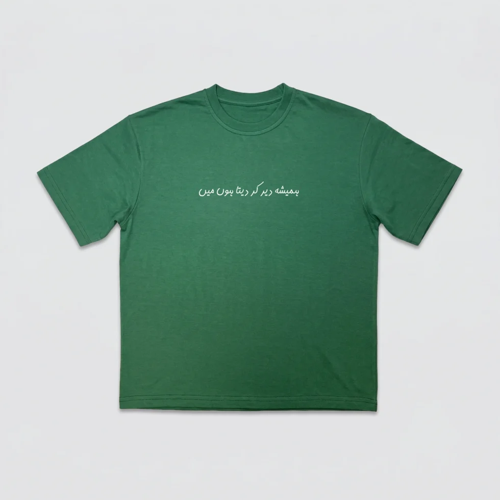Shop Yaqeen cotton drop shoulder T-shirt with oversized fit and breathable fabric. A unisex summer tee featuring minimal Urdu typography for everyday comfort.
